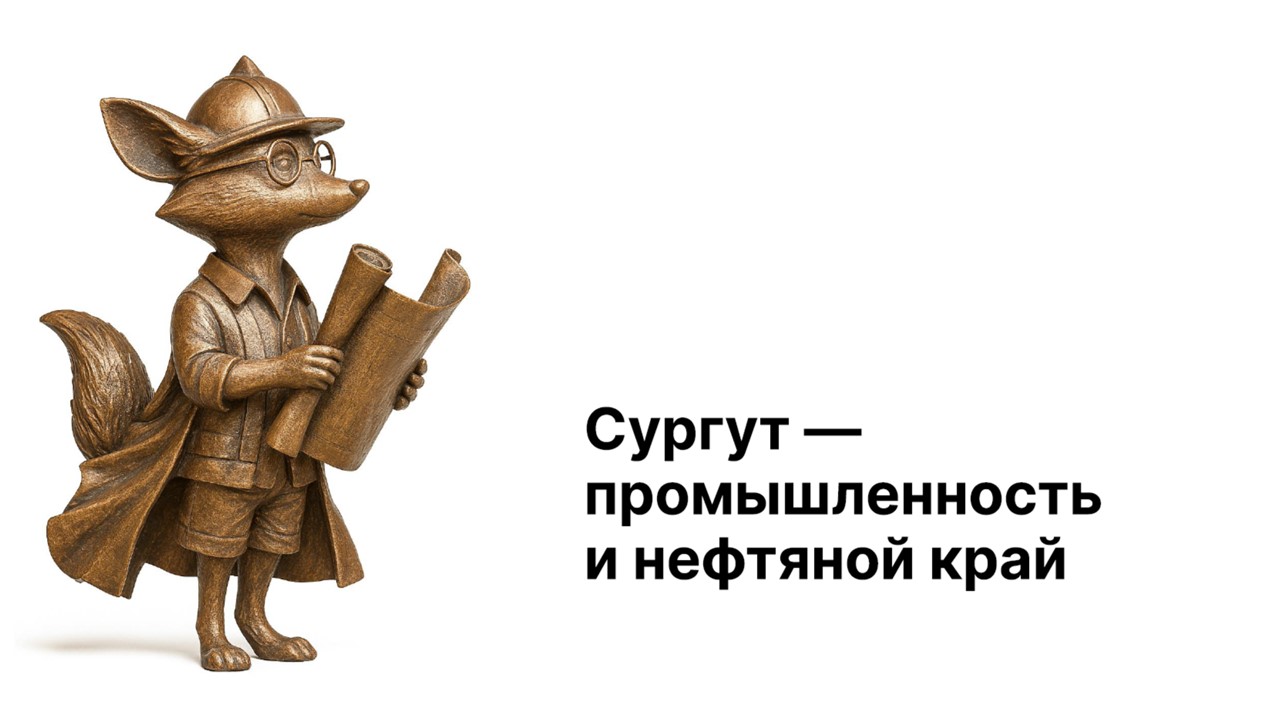 Я — Черный лисёнок, символ города Сургута. В моих лапах чертёж будущего развития региона. Я символизирую стремление к развитию и инновациям.